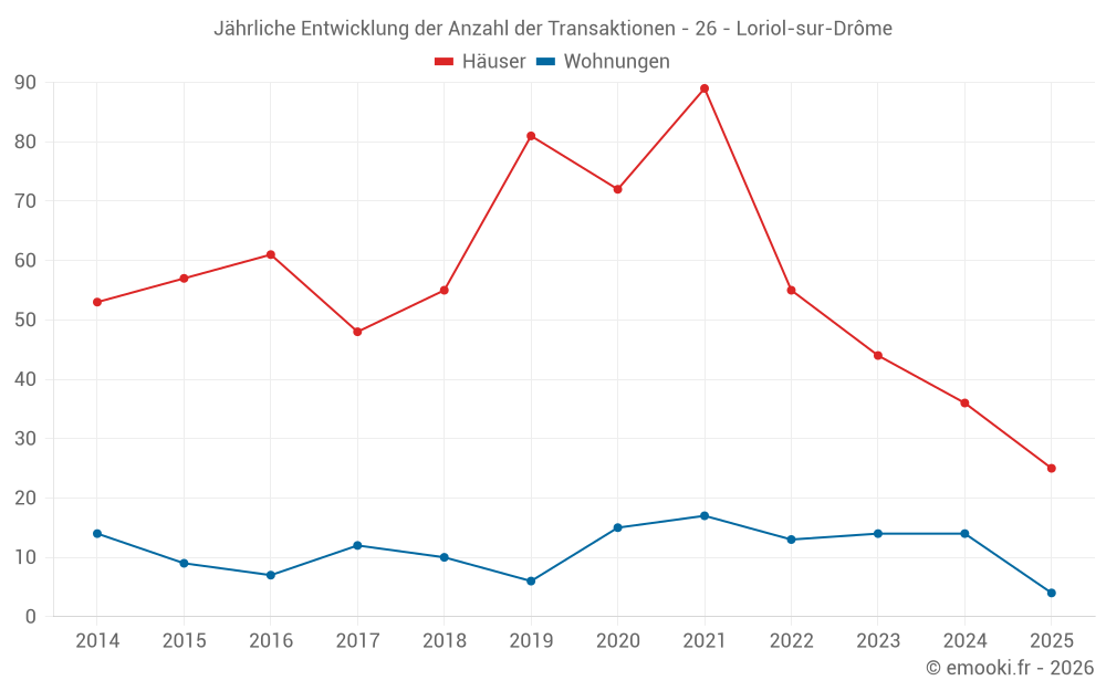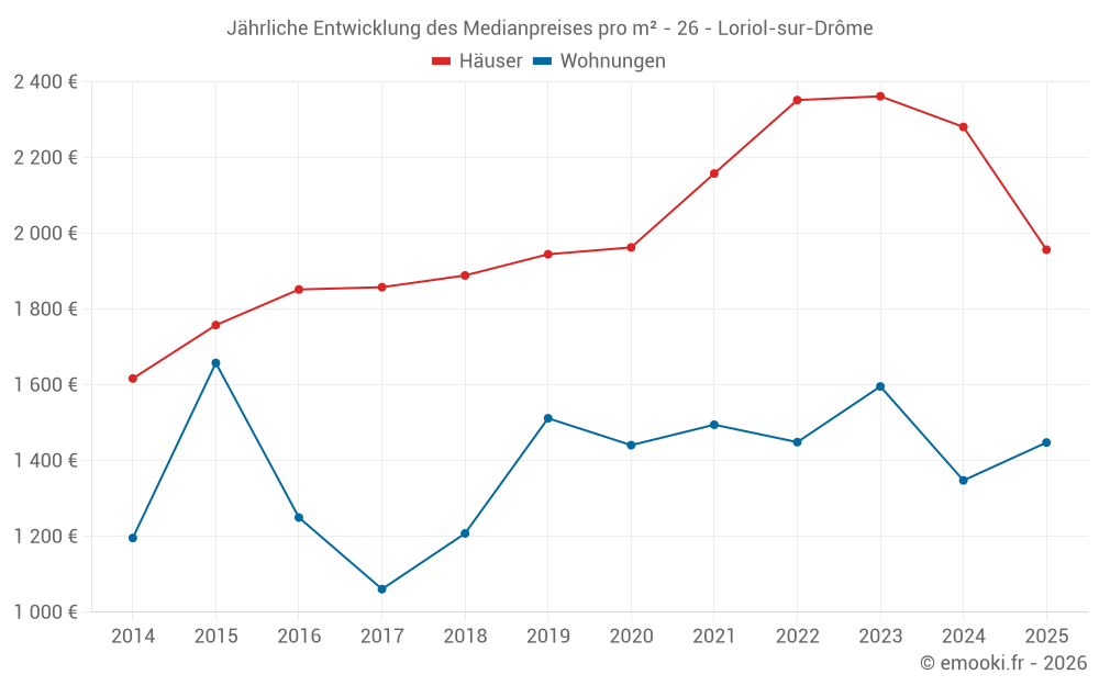 Der Durchschnittspreis auf den 25 Hausgeschäften der letzten 6 Monate in der Gemeinde Loriol-sur-Drôme betrug 1 957 € pro Quadratmeter für einen mittleren Immobilienwert von 205 000 €. Über diesen Zeitraum hinweg lagen 60% der Transaktionen zwischen 1 326 und 2 755 € pro Quadratmeter (vom 2. bis zum 8. Dezil).