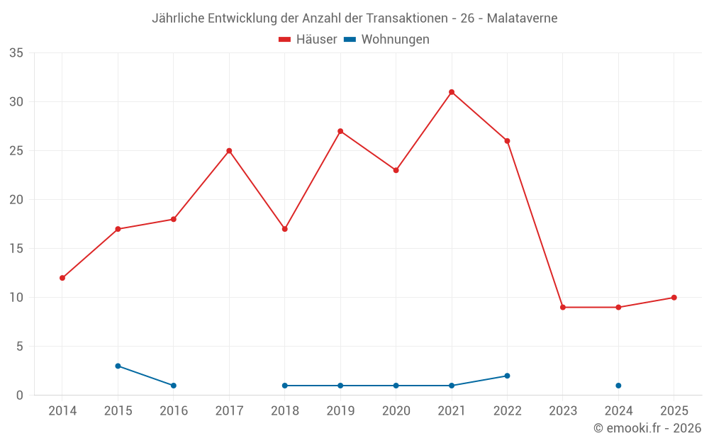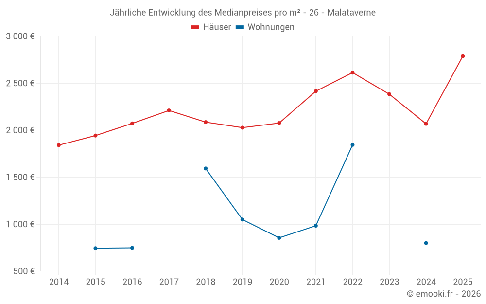 Der Durchschnittspreis auf den 24 Hausgeschäften der letzten 24 Monate in der Gemeinde Malataverne betrug 2 455 € pro Quadratmeter für einen mittleren Immobilienwert von 250 000 €. Über diesen Zeitraum hinweg lagen 60% der Transaktionen zwischen 1 907 und 3 167 € pro Quadratmeter (vom 2. bis zum 8. Dezil).