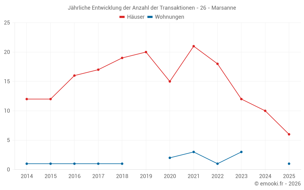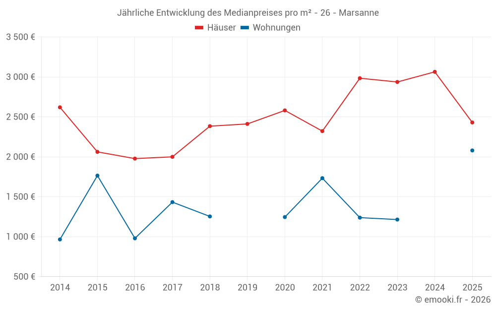 Der Durchschnittspreis auf den 21 Hausgeschäften der letzten 24 Monate in der Gemeinde Marsanne betrug 3 010 € pro Quadratmeter für einen mittleren Immobilienwert von 307 000 €. Über diesen Zeitraum hinweg lagen 60% der Transaktionen zwischen 2 159 und 3 843 € pro Quadratmeter (vom 2. bis zum 8. Dezil).