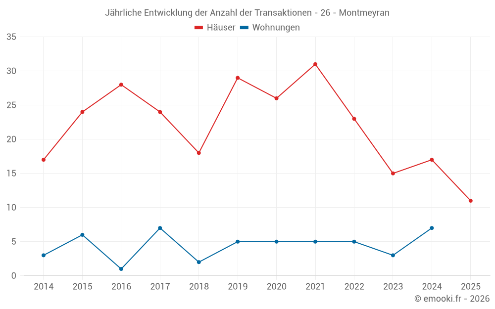 Der Durchschnittspreis auf den 21 Hausgeschäften der letzten 12 Monate in der Gemeinde Montmeyran betrug 2 289 € pro Quadratmeter für einen mittleren Immobilienwert von 305 000 €. Über diesen Zeitraum hinweg lagen 60% der Transaktionen zwischen 1 932 und 3 044 € pro Quadratmeter (vom 2. bis zum 8. Dezil).