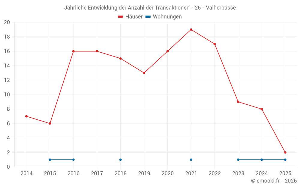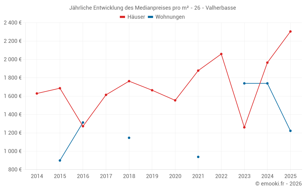 Der Durchschnittspreis auf den 15 Hausgeschäften der letzten 24 Monate in der Gemeinde Valherbasse betrug 1 755 € pro Quadratmeter für einen mittleren Immobilienwert von 172 000 €. Über diesen Zeitraum hinweg lagen 60% der Transaktionen zwischen 1 200 und 2 280 € pro Quadratmeter (vom 2. bis zum 8. Dezil).