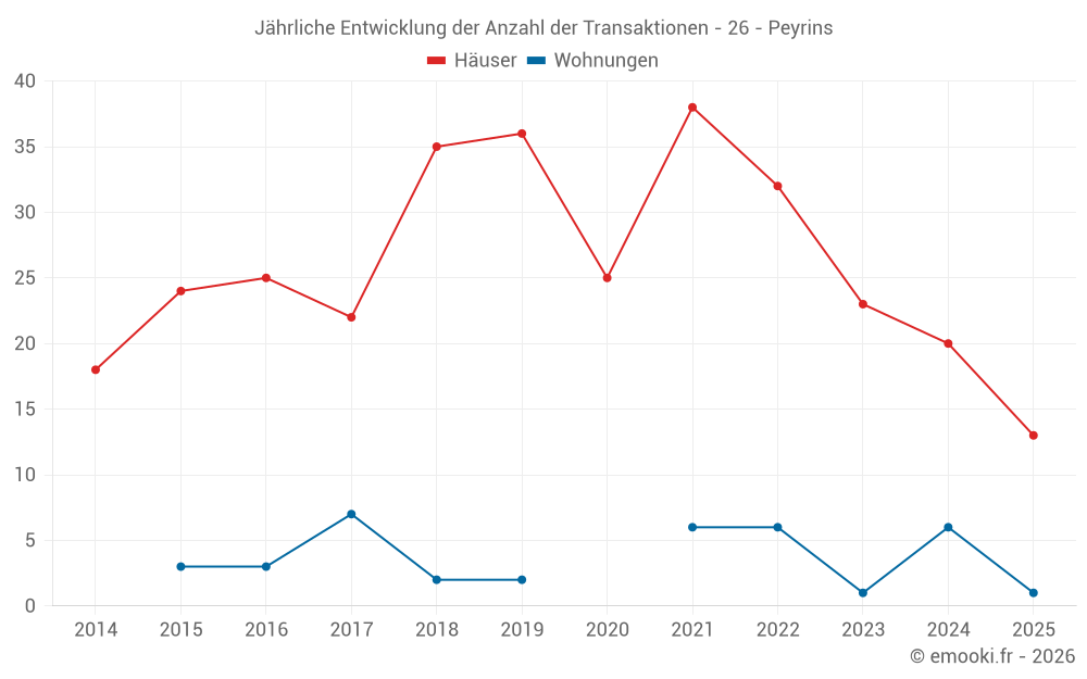 Der Durchschnittspreis auf den 24 Hausgeschäften der letzten 12 Monate in der Gemeinde Peyrins betrug 2 806 € pro Quadratmeter für einen mittleren Immobilienwert von 304 900 €. Über diesen Zeitraum hinweg lagen 60% der Transaktionen zwischen 2 446 und 3 187 € pro Quadratmeter (vom 2. bis zum 8. Dezil).