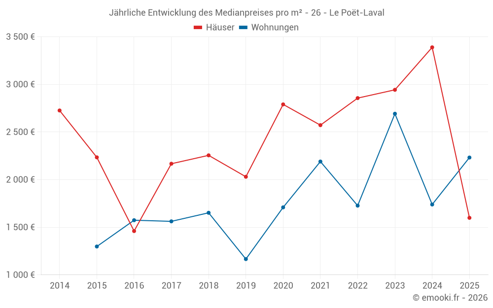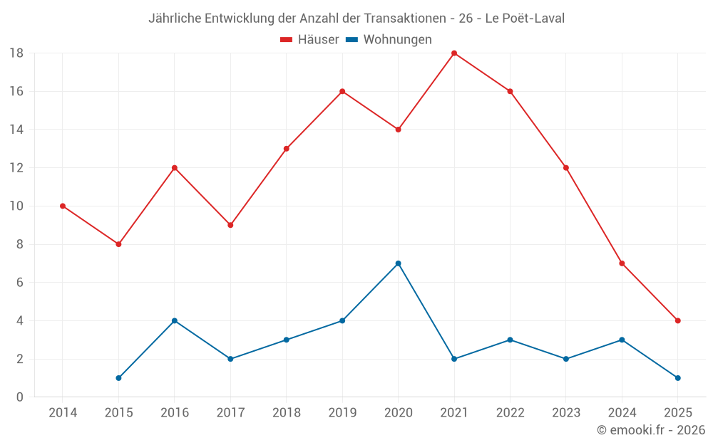 Der Durchschnittspreis auf den 18 Hausgeschäften der letzten 24 Monate in der Gemeinde Le Poët-Laval betrug 2 919 € pro Quadratmeter für einen mittleren Immobilienwert von 332 415 €. Über diesen Zeitraum hinweg lagen 60% der Transaktionen zwischen 1 772 und 4 020 € pro Quadratmeter (vom 2. bis zum 8. Dezil).