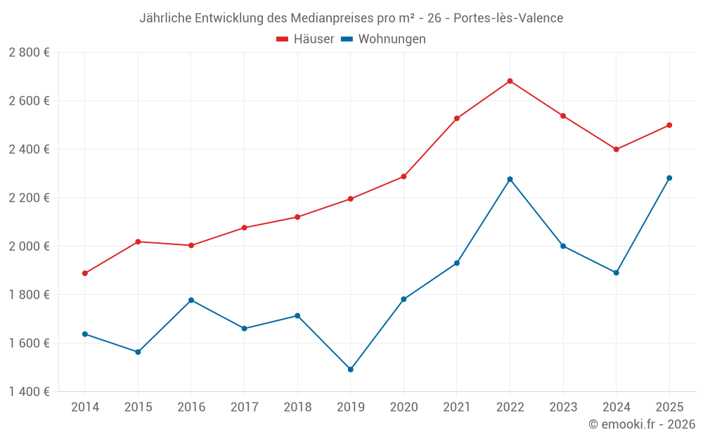 Der Durchschnittspreis auf den 31 Hausgeschäften der letzten 6 Monate in der Gemeinde Portes-lès-Valence betrug 2 500 € pro Quadratmeter für einen mittleren Immobilienwert von 232 000 €. Über diesen Zeitraum hinweg lagen 60% der Transaktionen zwischen 2 000 und 2 909 € pro Quadratmeter (vom 2. bis zum 8. Dezil).