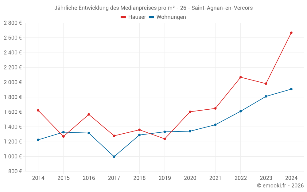 Der Durchschnittspreis auf den 16 Wohnungstransaktionen der letzten 24 Monate in der Gemeinde Saint-Agnan-en-Vercors betrug 1 914 € pro Quadratmeter für einen mittleren Immobilienwert von 40 185 €. Über diesen Zeitraum hinweg lagen 60% der Transaktionen zwischen 1 716 und 2 239 € pro Quadratmeter (vom 2. bis zum 8. Dezil).