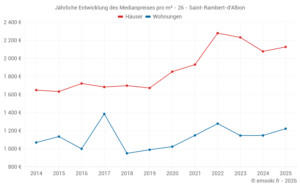 Der Durchschnittspreis auf den 15 Wohnungstransaktionen der letzten 24 Monate in der Gemeinde Saint-Rambert-d'Albon betrug 1 133 € pro Quadratmeter für einen mittleren Immobilienwert von 125 000 €. Über diesen Zeitraum hinweg lagen 60% der Transaktionen zwischen 978 und 1 450 € pro Quadratmeter (vom 2. bis zum 8. Dezil).
