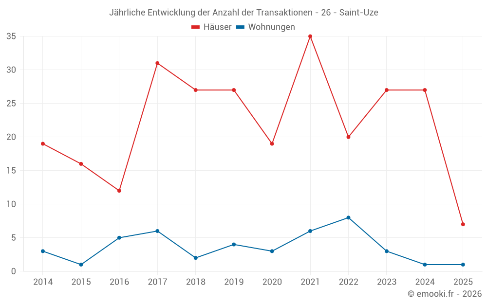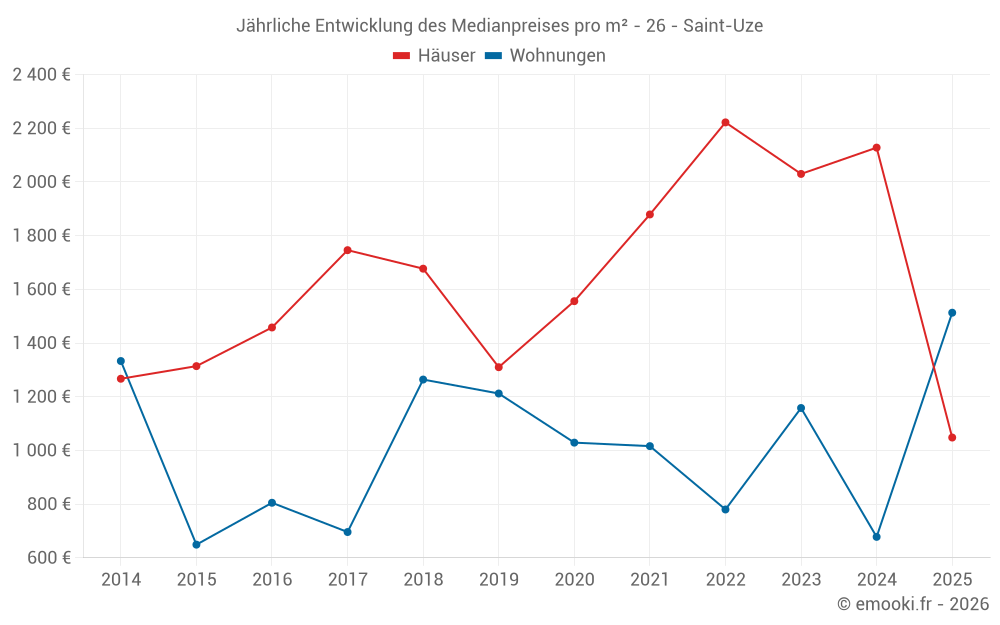 Der Durchschnittspreis auf den 24 Hausgeschäften der letzten 12 Monate in der Gemeinde Saint-Uze betrug 1 983 € pro Quadratmeter für einen mittleren Immobilienwert von 205 325 €. Über diesen Zeitraum hinweg lagen 60% der Transaktionen zwischen 1 009 und 2 376 € pro Quadratmeter (vom 2. bis zum 8. Dezil).