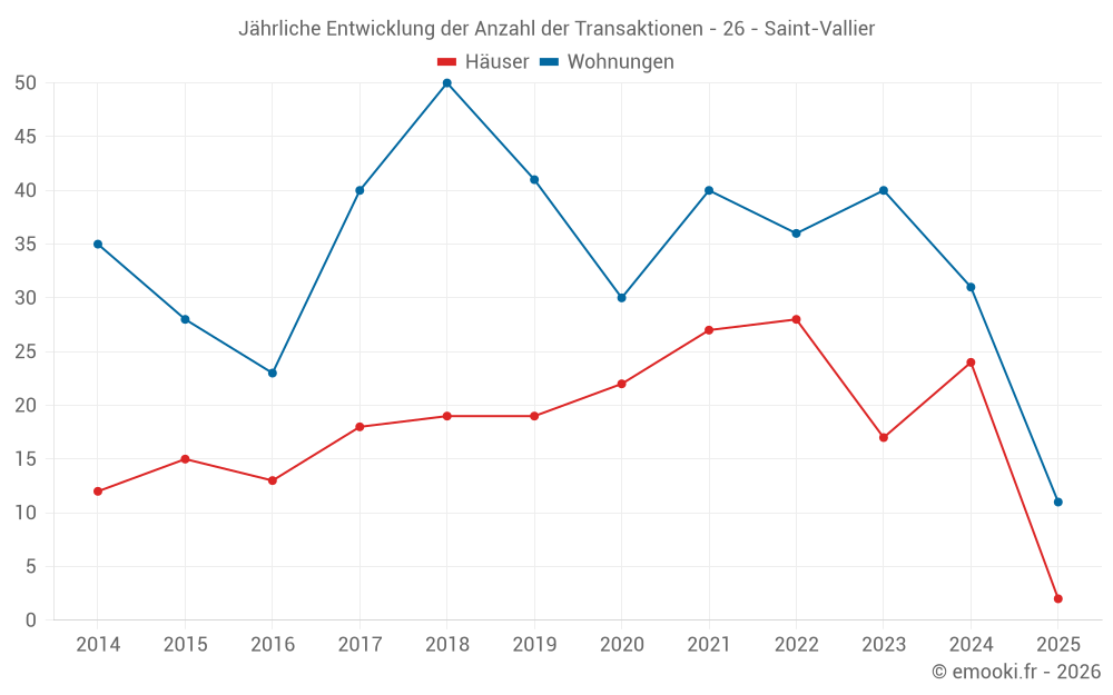 Der Durchschnittspreis auf den 33 Hausgeschäften der letzten 24 Monate in der Gemeinde Saint-Vallier betrug 1 727 € pro Quadratmeter für einen mittleren Immobilienwert von 150 200 €. Über diesen Zeitraum hinweg lagen 60% der Transaktionen zwischen 966 und 2 106 € pro Quadratmeter (vom 2. bis zum 8. Dezil).