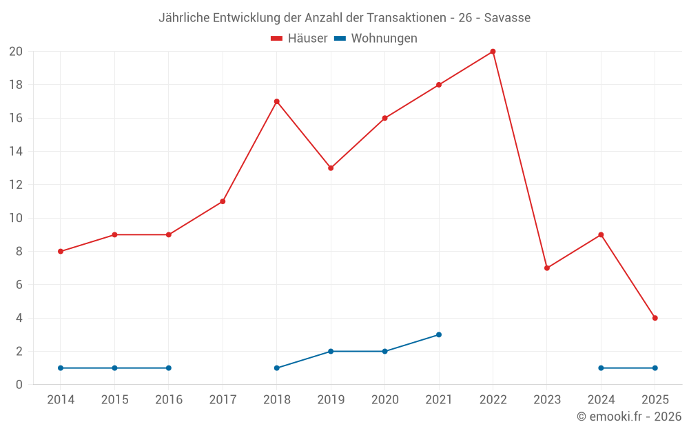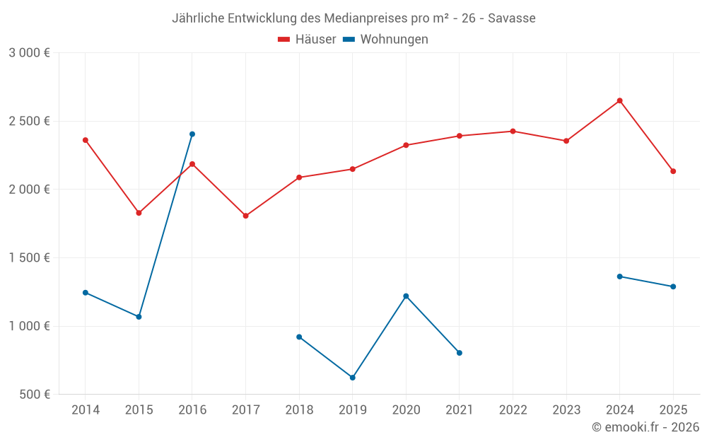 Der Durchschnittspreis auf den 14 Hausgeschäften der letzten 24 Monate in der Gemeinde Savasse betrug 2 540 € pro Quadratmeter für einen mittleren Immobilienwert von 291 078 €. Über diesen Zeitraum hinweg lagen 60% der Transaktionen zwischen 2 140 und 3 028 € pro Quadratmeter (vom 2. bis zum 8. Dezil).