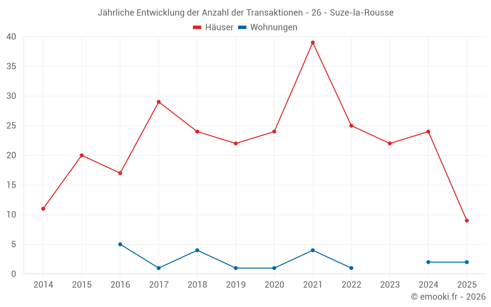 Der Durchschnittspreis auf den 26 Hausgeschäften der letzten 12 Monate in der Gemeinde Suze-la-Rousse betrug 2 700 € pro Quadratmeter für einen mittleren Immobilienwert von 260 000 €. Über diesen Zeitraum hinweg lagen 60% der Transaktionen zwischen 2 302 und 3 211 € pro Quadratmeter (vom 2. bis zum 8. Dezil).