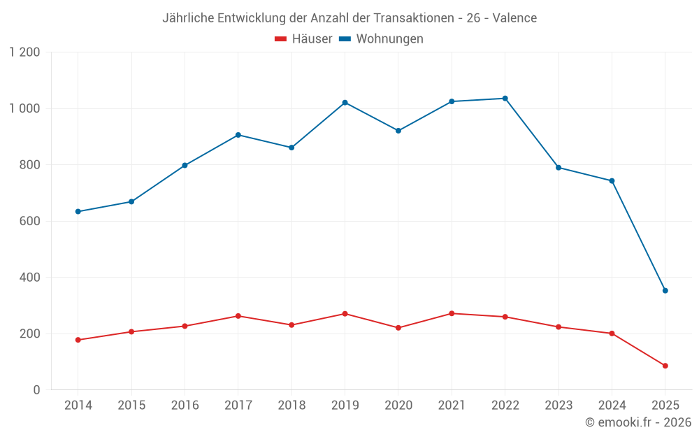 Der Durchschnittspreis auf den 166 Wohnungstransaktionen der letzten 3 Monate in der Gemeinde Valence betrug 1 911 € pro Quadratmeter für einen mittleren Immobilienwert von 125 000 €. Über diesen Zeitraum hinweg lagen 60% der Transaktionen zwischen 1 471 und 2 610 € pro Quadratmeter (vom 2. bis zum 8. Dezil).