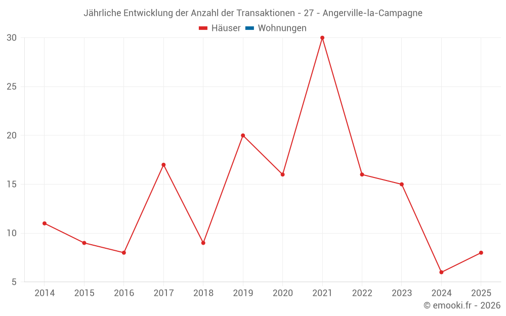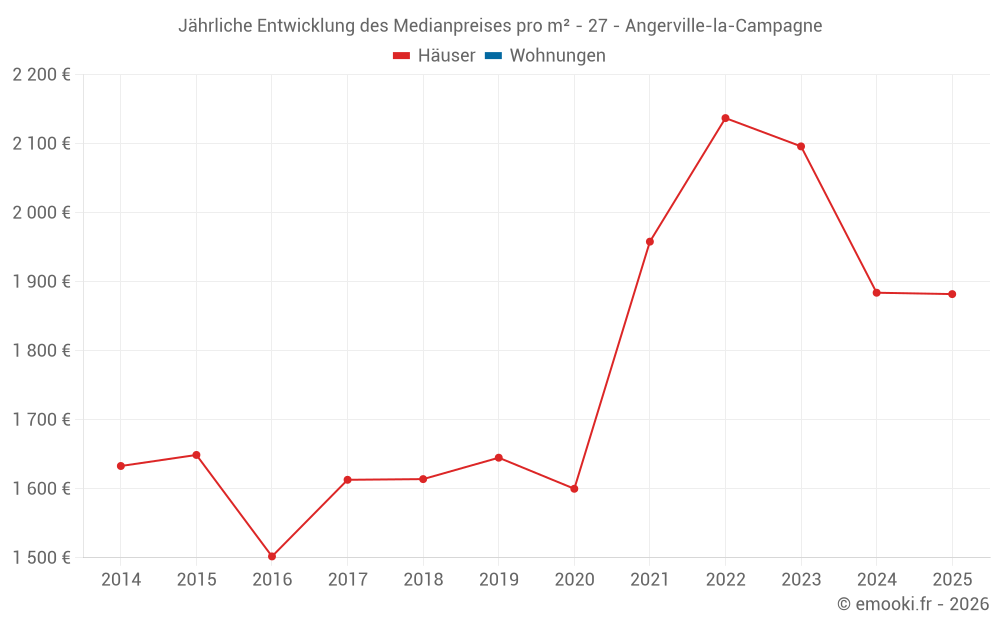 Der Durchschnittspreis auf den 21 Hausgeschäften der letzten 24 Monate in der Gemeinde Angerville-la-Campagne betrug 1 986 € pro Quadratmeter für einen mittleren Immobilienwert von 180 000 €. Über diesen Zeitraum hinweg lagen 60% der Transaktionen zwischen 1 705 und 2 282 € pro Quadratmeter (vom 2. bis zum 8. Dezil).