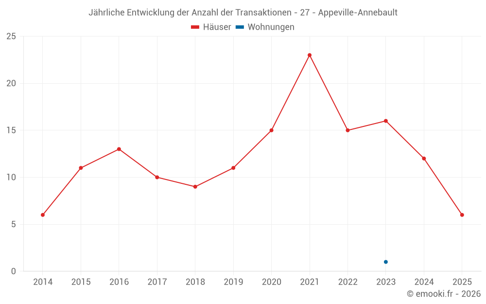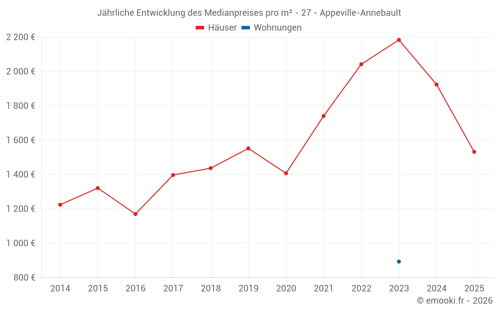 Der Durchschnittspreis auf den 23 Hausgeschäften der letzten 24 Monate in der Gemeinde Appeville-Annebault betrug 1 822 € pro Quadratmeter für einen mittleren Immobilienwert von 172 100 €. Über diesen Zeitraum hinweg lagen 60% der Transaktionen zwischen 1 377 und 2 220 € pro Quadratmeter (vom 2. bis zum 8. Dezil).
