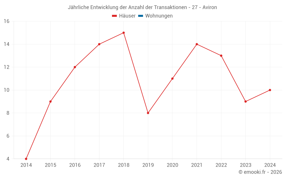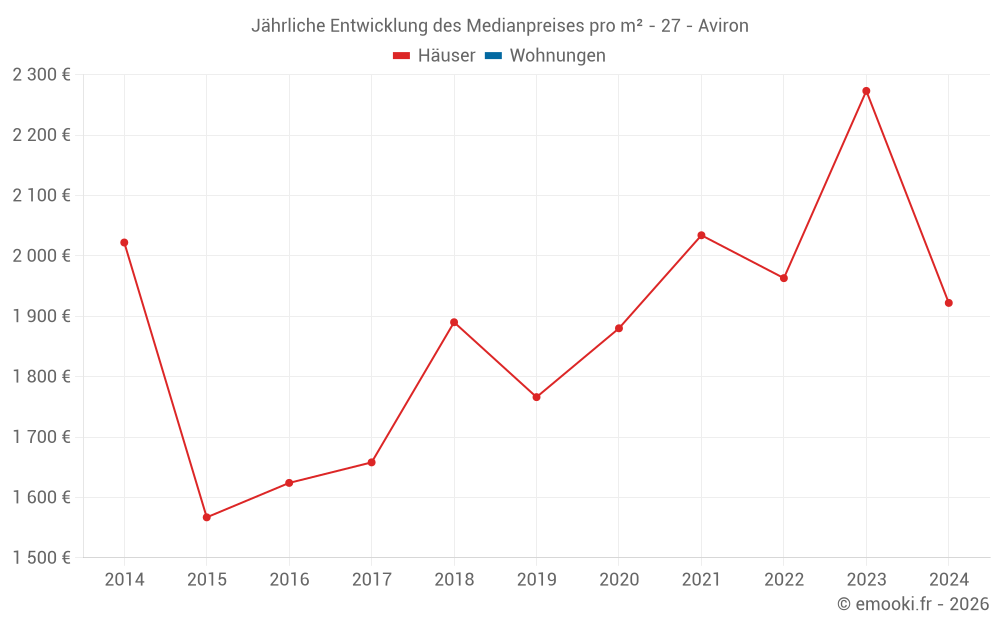 Der Durchschnittspreis auf den 15 Hausgeschäften der letzten 24 Monate in der Gemeinde Aviron betrug 2 213 € pro Quadratmeter für einen mittleren Immobilienwert von 200 000 €. Über diesen Zeitraum hinweg lagen 60% der Transaktionen zwischen 1 864 und 2 497 € pro Quadratmeter (vom 2. bis zum 8. Dezil).