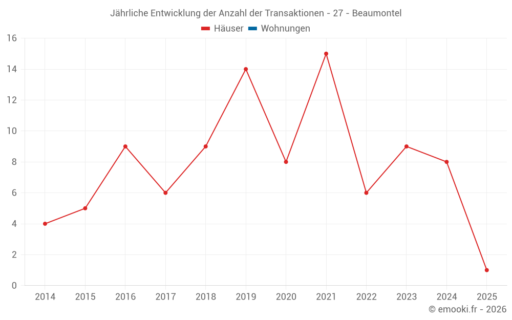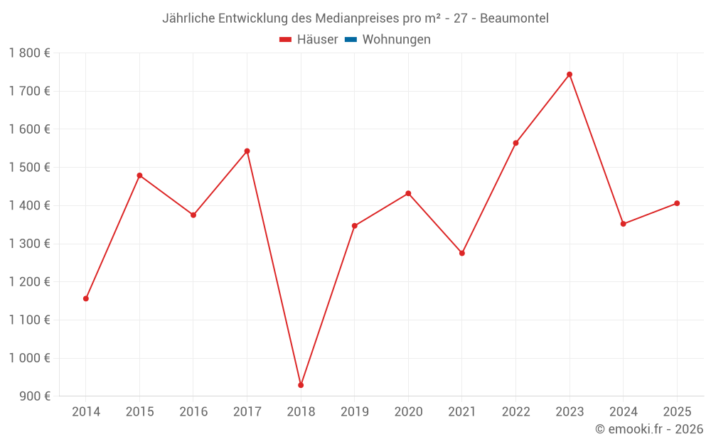 Der Durchschnittspreis auf den 16 Hausgeschäften der letzten 24 Monate in der Gemeinde Beaumontel betrug 1 688 € pro Quadratmeter für einen mittleren Immobilienwert von 165 000 €. Über diesen Zeitraum hinweg lagen 60% der Transaktionen zwischen 1 324 und 1 978 € pro Quadratmeter (vom 2. bis zum 8. Dezil).