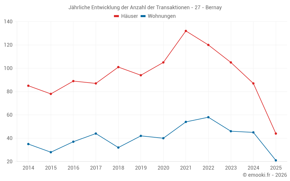 Der Durchschnittspreis auf den 44 Hausgeschäften der letzten 6 Monate in der Gemeinde Bernay betrug 1 950 € pro Quadratmeter für einen mittleren Immobilienwert von 176 250 €. Über diesen Zeitraum hinweg lagen 60% der Transaktionen zwischen 1 233 und 2 377 € pro Quadratmeter (vom 2. bis zum 8. Dezil).