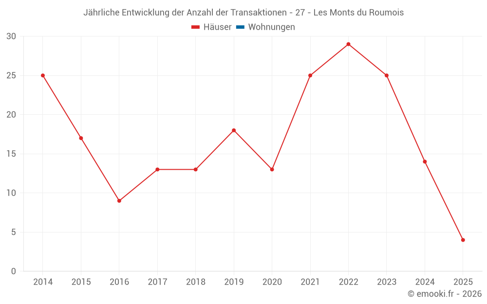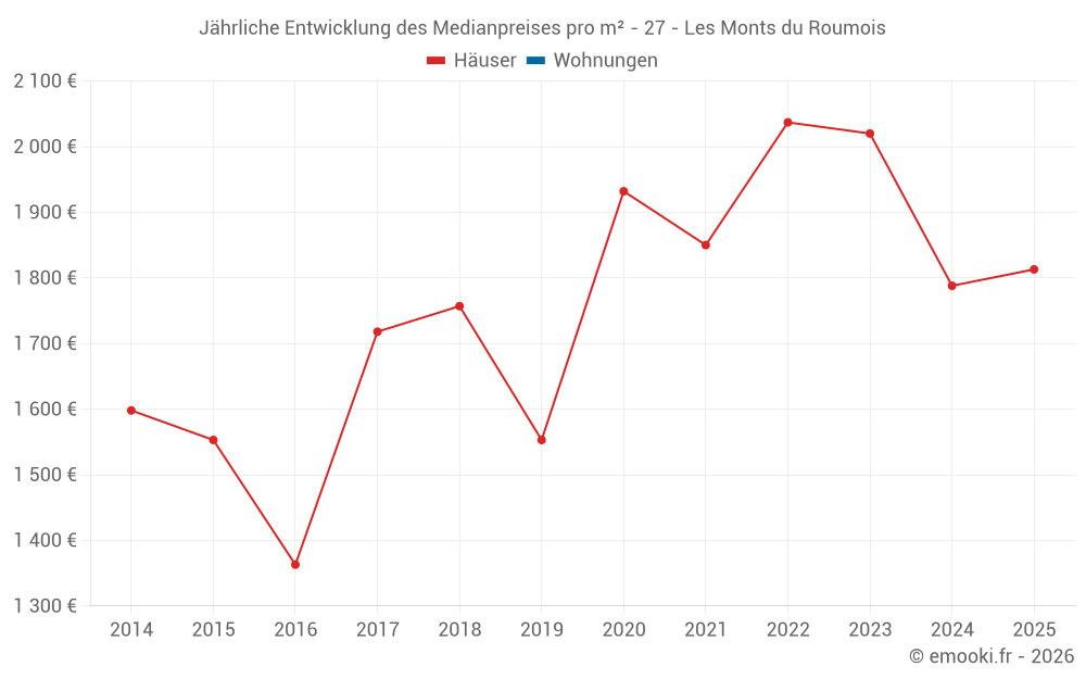 Der Durchschnittspreis auf den 29 Hausgeschäften der letzten 24 Monate in der Gemeinde Les Monts du Roumois betrug 1 908 € pro Quadratmeter für einen mittleren Immobilienwert von 185 000 €. Über diesen Zeitraum hinweg lagen 60% der Transaktionen zwischen 1 023 und 2 360 € pro Quadratmeter (vom 2. bis zum 8. Dezil).