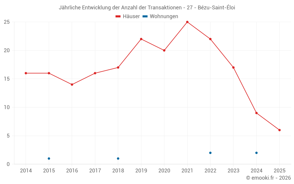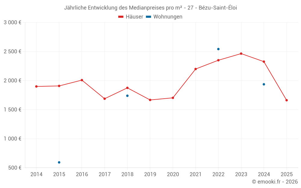 Der Durchschnittspreis auf den 25 Hausgeschäften der letzten 24 Monate in der Gemeinde Bézu-Saint-Éloi betrug 2 167 € pro Quadratmeter für einen mittleren Immobilienwert von 186 200 €. Über diesen Zeitraum hinweg lagen 60% der Transaktionen zwischen 1 620 und 2 775 € pro Quadratmeter (vom 2. bis zum 8. Dezil).
