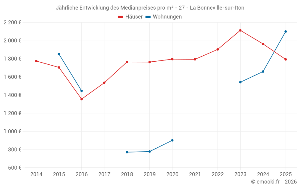Der Durchschnittspreis auf den 22 Hausgeschäften der letzten 12 Monate in der Gemeinde La Bonneville-sur-Iton betrug 1 964 € pro Quadratmeter für einen mittleren Immobilienwert von 142 400 €. Über diesen Zeitraum hinweg lagen 60% der Transaktionen zwischen 1 562 und 2 322 € pro Quadratmeter (vom 2. bis zum 8. Dezil).