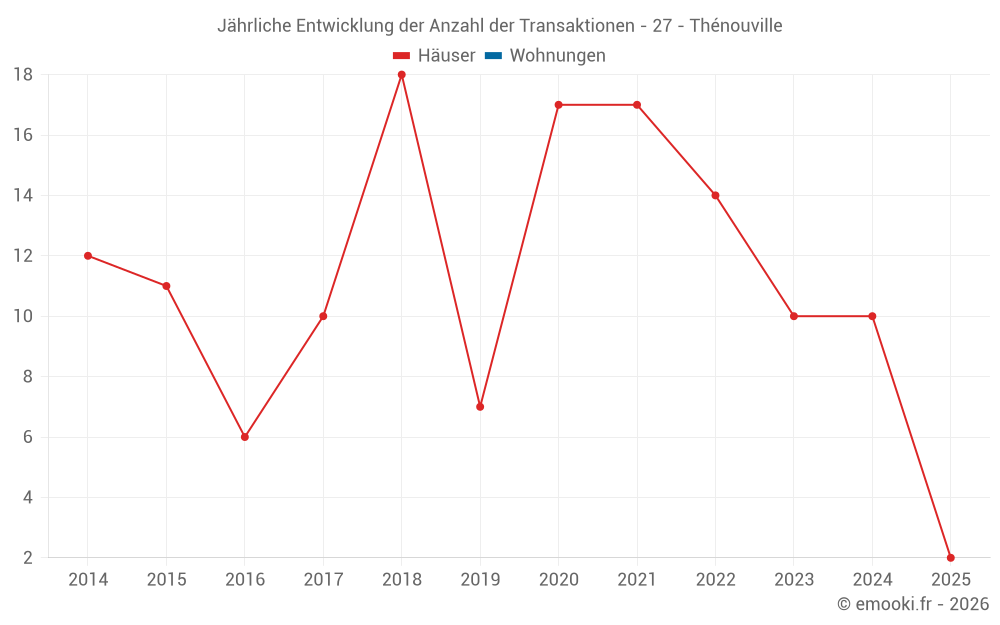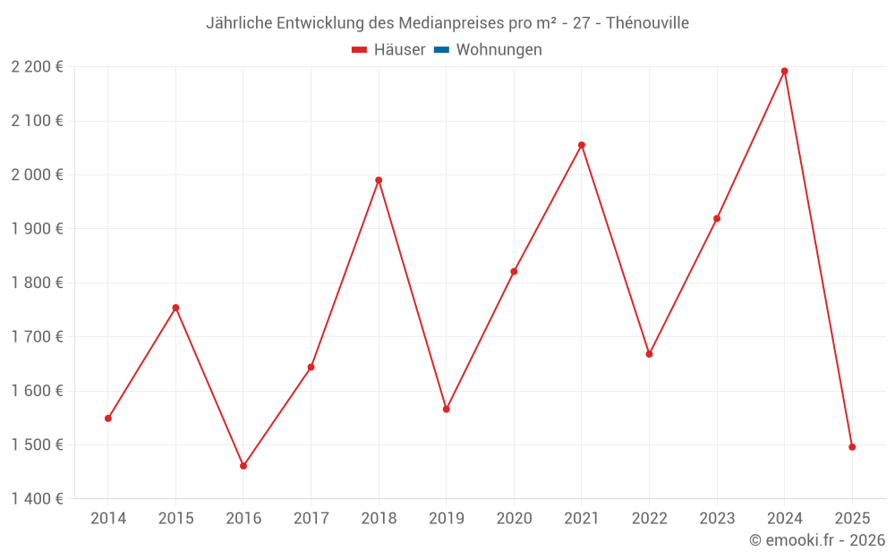 Der Durchschnittspreis auf den 18 Hausgeschäften der letzten 24 Monate in der Gemeinde Thénouville betrug 2 024 € pro Quadratmeter für einen mittleren Immobilienwert von 231 950 €. Über diesen Zeitraum hinweg lagen 60% der Transaktionen zwischen 1 466 und 2 549 € pro Quadratmeter (vom 2. bis zum 8. Dezil).