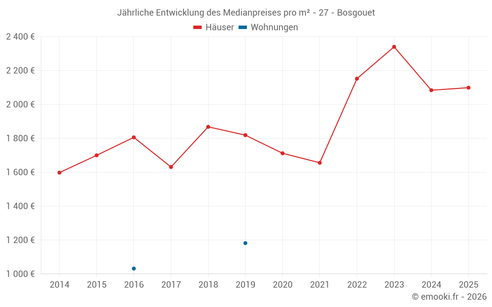 Der Durchschnittspreis auf den 15 Hausgeschäften der letzten 24 Monate in der Gemeinde Bosgouet betrug 2 099 € pro Quadratmeter für einen mittleren Immobilienwert von 195 000 €. Über diesen Zeitraum hinweg lagen 60% der Transaktionen zwischen 1 774 und 2 523 € pro Quadratmeter (vom 2. bis zum 8. Dezil).