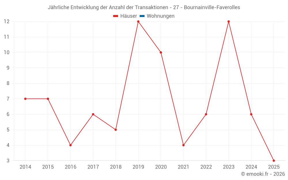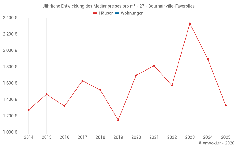 Der Durchschnittspreis auf den 15 Hausgeschäften der letzten 24 Monate in der Gemeinde Bournainville-Faverolles betrug 2 292 € pro Quadratmeter für einen mittleren Immobilienwert von 205 000 €. Über diesen Zeitraum hinweg lagen 60% der Transaktionen zwischen 1 570 und 2 536 € pro Quadratmeter (vom 2. bis zum 8. Dezil).
