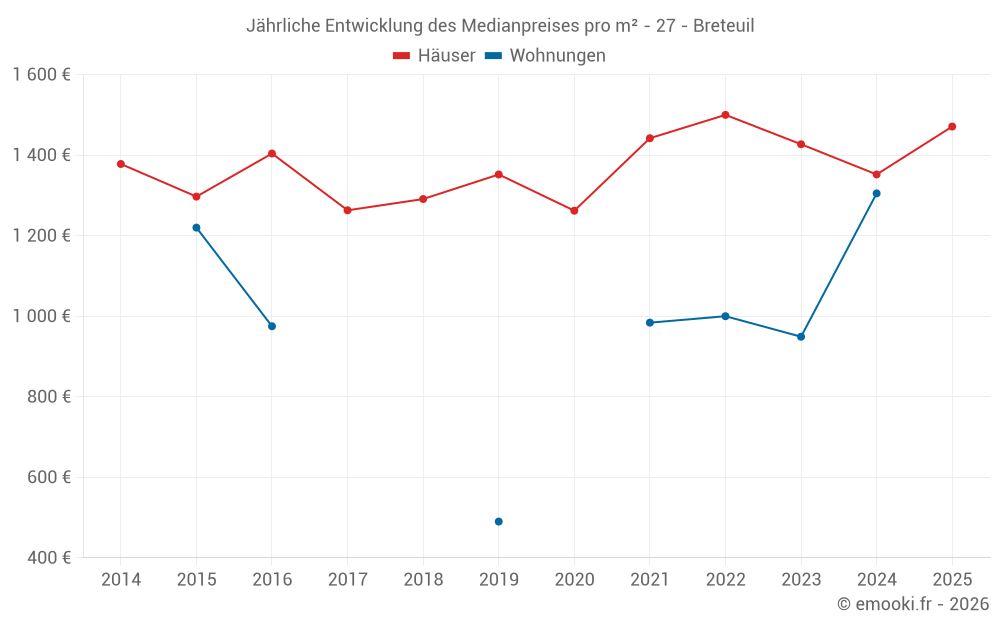 Der Durchschnittspreis auf den 31 Hausgeschäften der letzten 6 Monate in der Gemeinde Breteuil betrug 1 471 € pro Quadratmeter für einen mittleren Immobilienwert von 130 000 €. Über diesen Zeitraum hinweg lagen 60% der Transaktionen zwischen 1 024 und 1 775 € pro Quadratmeter (vom 2. bis zum 8. Dezil).