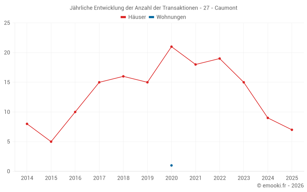 Der Durchschnittspreis auf den 23 Hausgeschäften der letzten 24 Monate in der Gemeinde Caumont betrug 1 851 € pro Quadratmeter für einen mittleren Immobilienwert von 240 500 €. Über diesen Zeitraum hinweg lagen 60% der Transaktionen zwischen 1 331 und 2 525 € pro Quadratmeter (vom 2. bis zum 8. Dezil).