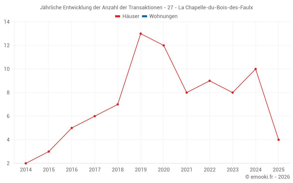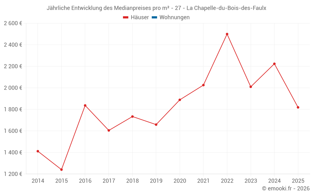 Der Durchschnittspreis auf den 19 Hausgeschäften der letzten 24 Monate in der Gemeinde La Chapelle-du-Bois-des-Faulx betrug 2 222 € pro Quadratmeter für einen mittleren Immobilienwert von 231 550 €. Über diesen Zeitraum hinweg lagen 60% der Transaktionen zwischen 1 418 und 2 626 € pro Quadratmeter (vom 2. bis zum 8. Dezil).