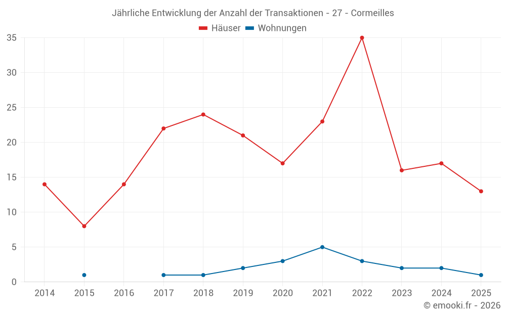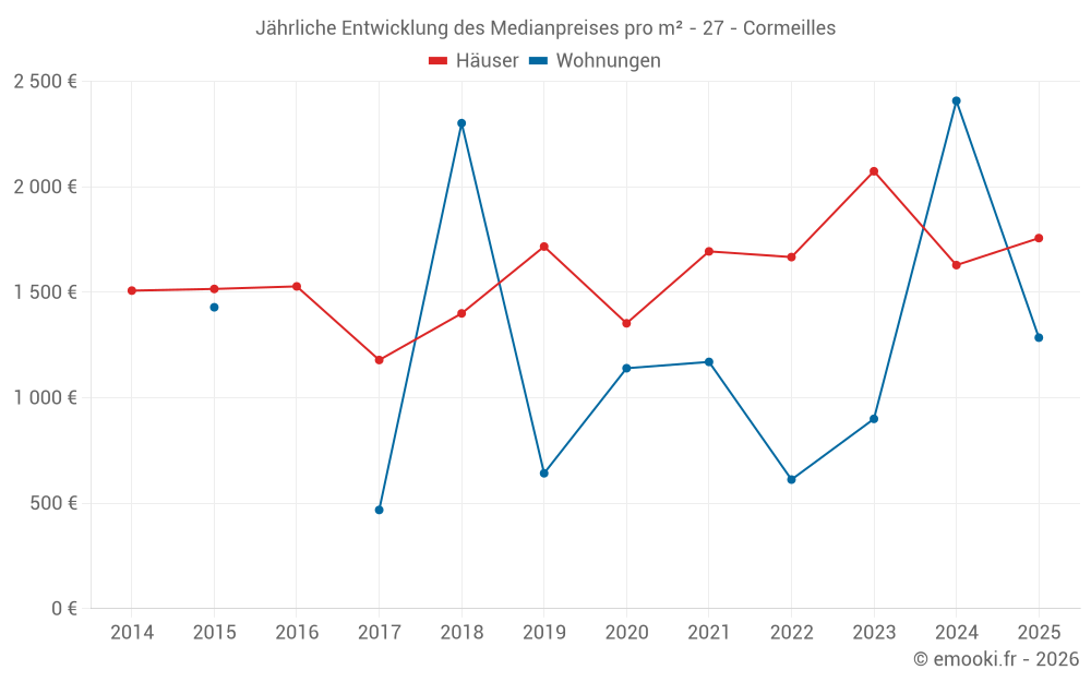 Der Durchschnittspreis auf den 21 Hausgeschäften der letzten 12 Monate in der Gemeinde Cormeilles betrug 1 676 € pro Quadratmeter für einen mittleren Immobilienwert von 130 000 €. Über diesen Zeitraum hinweg lagen 60% der Transaktionen zwischen 912 und 2 134 € pro Quadratmeter (vom 2. bis zum 8. Dezil).