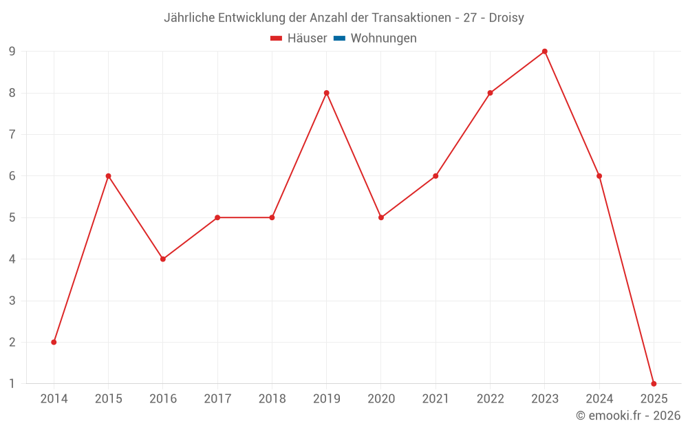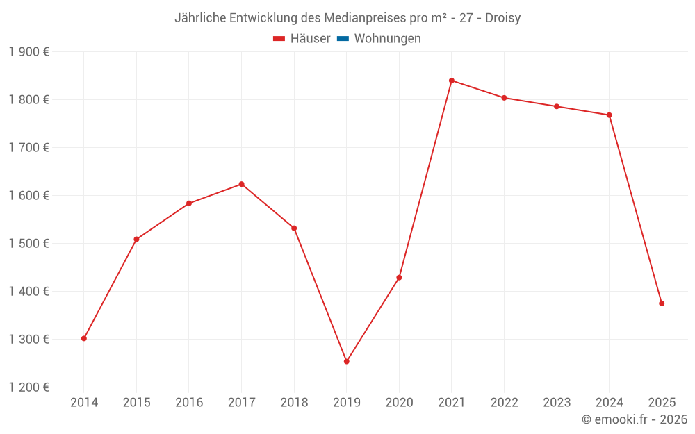 Der Durchschnittspreis auf den 14 Hausgeschäften der letzten 24 Monate in der Gemeinde Droisy betrug 1 768 € pro Quadratmeter für einen mittleren Immobilienwert von 171 500 €. Über diesen Zeitraum hinweg lagen 60% der Transaktionen zwischen 1 170 und 1 962 € pro Quadratmeter (vom 2. bis zum 8. Dezil).