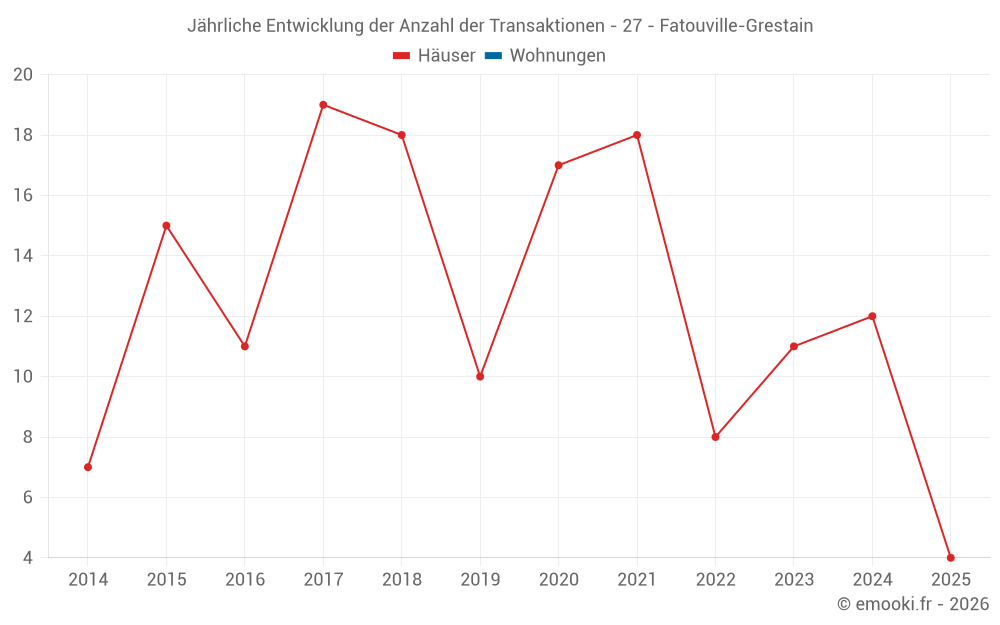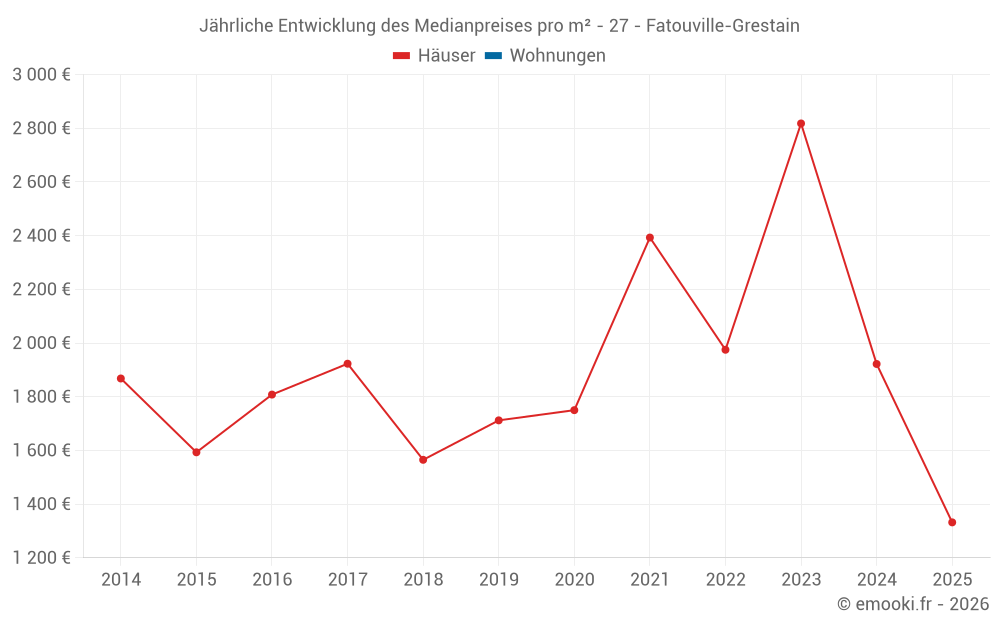 Der Durchschnittspreis auf den 26 Hausgeschäften der letzten 24 Monate in der Gemeinde Fatouville-Grestain betrug 2 110 € pro Quadratmeter für einen mittleren Immobilienwert von 218 325 €. Über diesen Zeitraum hinweg lagen 60% der Transaktionen zwischen 1 225 und 2 973 € pro Quadratmeter (vom 2. bis zum 8. Dezil).