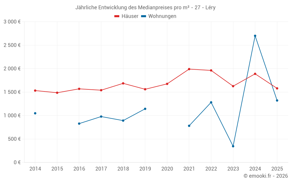 Der Durchschnittspreis auf den 30 Hausgeschäften der letzten 24 Monate in der Gemeinde Léry betrug 1 855 € pro Quadratmeter für einen mittleren Immobilienwert von 158 825 €. Über diesen Zeitraum hinweg lagen 60% der Transaktionen zwischen 1 428 und 2 216 € pro Quadratmeter (vom 2. bis zum 8. Dezil).