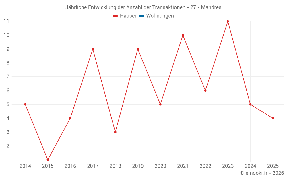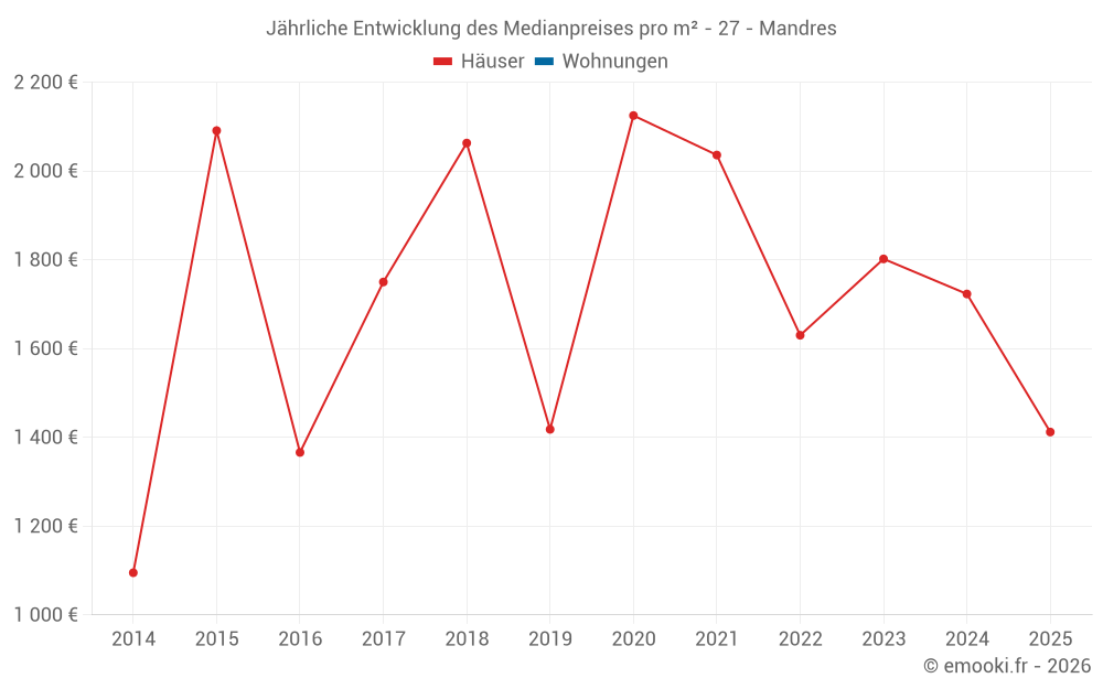 Der Durchschnittspreis auf den 14 Hausgeschäften der letzten 24 Monate in der Gemeinde Mandres betrug 1 606 € pro Quadratmeter für einen mittleren Immobilienwert von 143 000 €. Über diesen Zeitraum hinweg lagen 60% der Transaktionen zwischen 1 253 und 2 028 € pro Quadratmeter (vom 2. bis zum 8. Dezil).