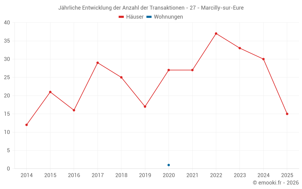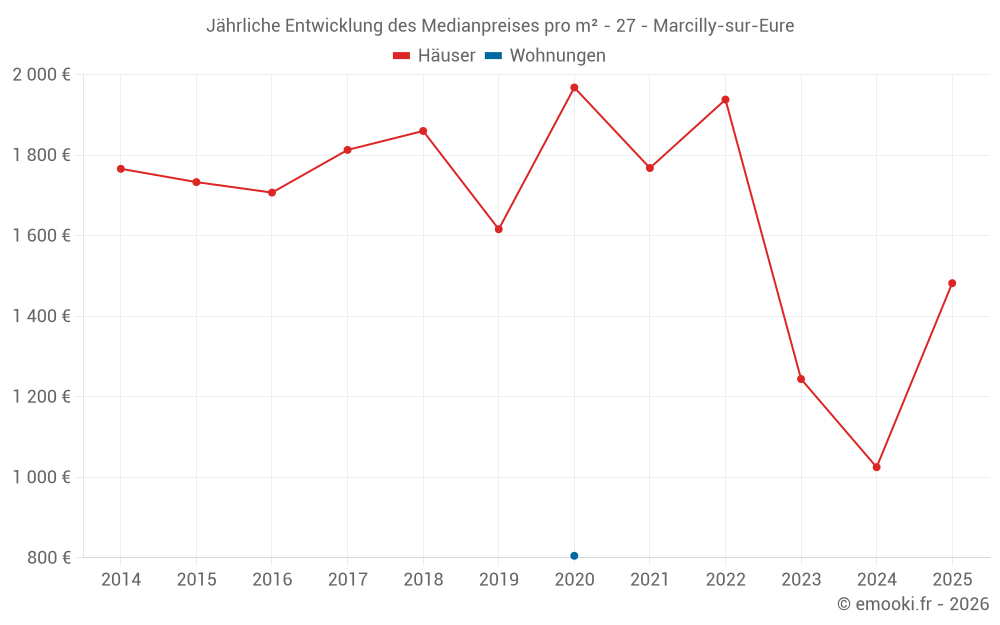 Der Durchschnittspreis auf den 30 Hausgeschäften der letzten 12 Monate in der Gemeinde Marcilly-sur-Eure betrug 1 464 € pro Quadratmeter für einen mittleren Immobilienwert von 171 125 €. Über diesen Zeitraum hinweg lagen 60% der Transaktionen zwischen 669 und 1 882 € pro Quadratmeter (vom 2. bis zum 8. Dezil).
