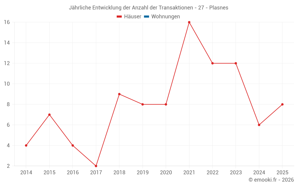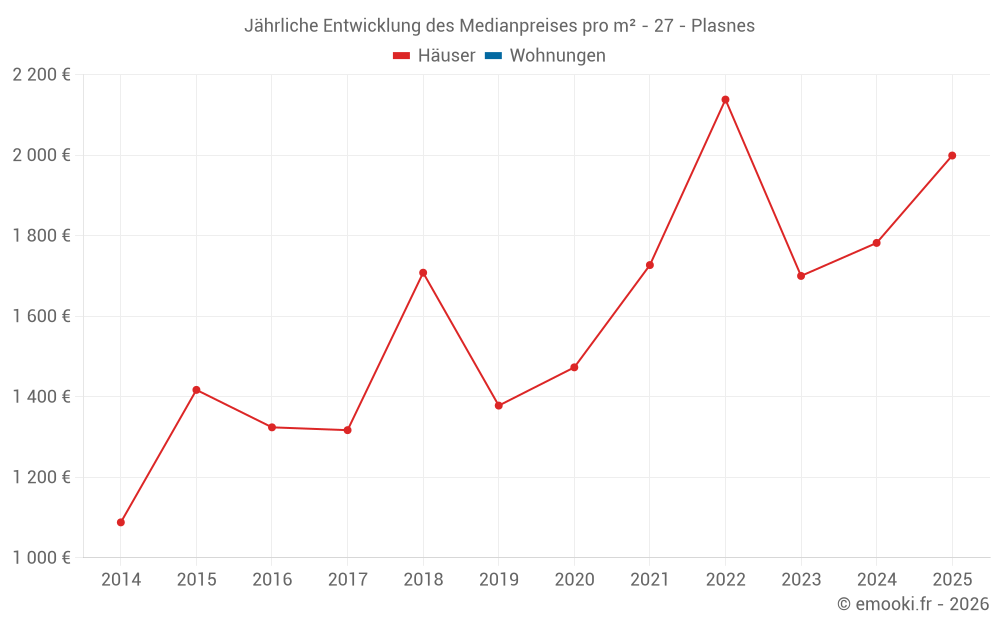 Der Durchschnittspreis auf den 22 Hausgeschäften der letzten 24 Monate in der Gemeinde Plasnes betrug 1 786 € pro Quadratmeter für einen mittleren Immobilienwert von 193 838 €. Über diesen Zeitraum hinweg lagen 60% der Transaktionen zwischen 1 488 und 2 197 € pro Quadratmeter (vom 2. bis zum 8. Dezil).