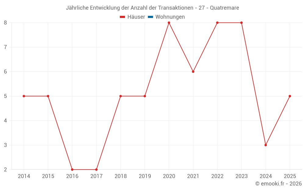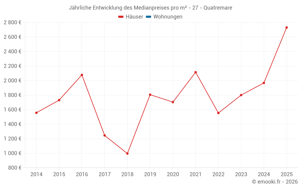 Der Durchschnittspreis auf den 14 Hausgeschäften der letzten 24 Monate in der Gemeinde Quatremare betrug 2 142 € pro Quadratmeter für einen mittleren Immobilienwert von 195 000 €. Über diesen Zeitraum hinweg lagen 60% der Transaktionen zwischen 931 und 2 855 € pro Quadratmeter (vom 2. bis zum 8. Dezil).