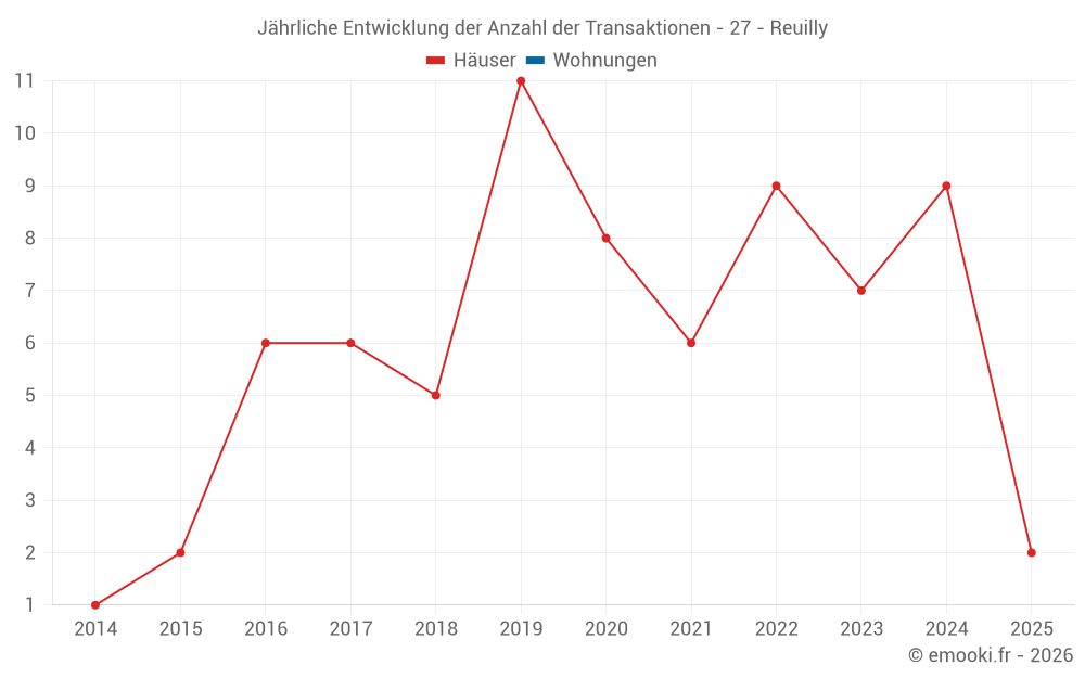 Der Durchschnittspreis auf den 15 Hausgeschäften der letzten 24 Monate in der Gemeinde Reuilly betrug 2 140 € pro Quadratmeter für einen mittleren Immobilienwert von 201 000 €. Über diesen Zeitraum hinweg lagen 60% der Transaktionen zwischen 1 489 und 2 390 € pro Quadratmeter (vom 2. bis zum 8. Dezil).