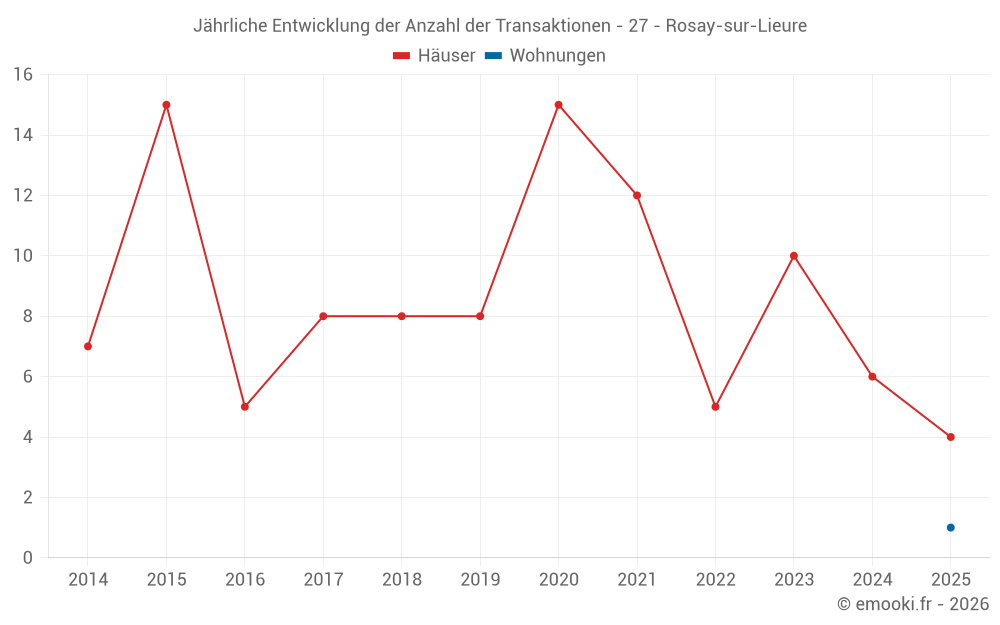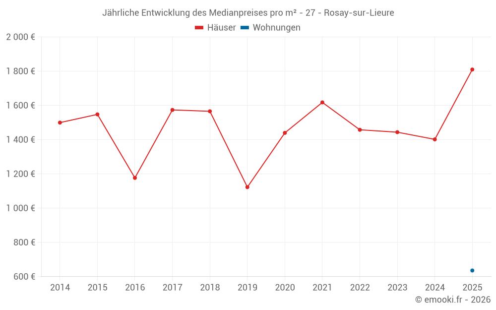 Der Durchschnittspreis auf den 15 Hausgeschäften der letzten 24 Monate in der Gemeinde Rosay-sur-Lieure betrug 1 532 € pro Quadratmeter für einen mittleren Immobilienwert von 140 000 €. Über diesen Zeitraum hinweg lagen 60% der Transaktionen zwischen 1 042 und 1 811 € pro Quadratmeter (vom 2. bis zum 8. Dezil).