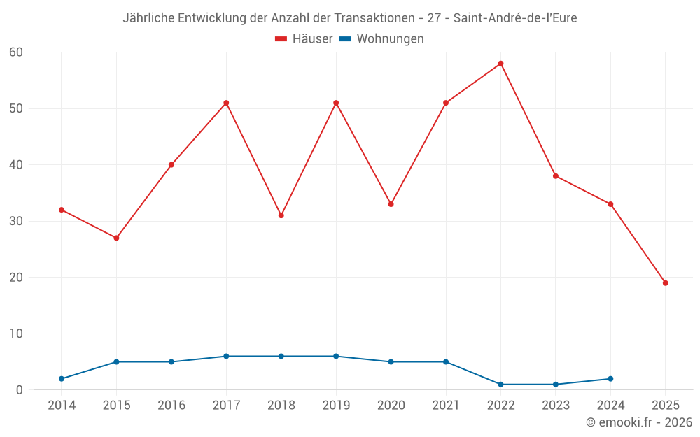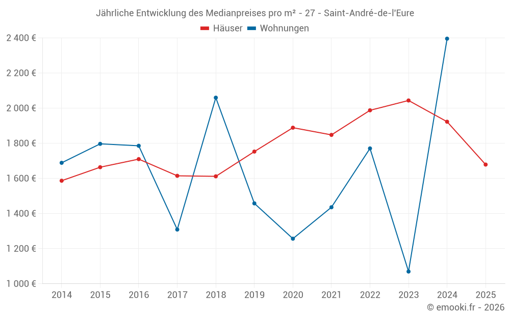 Der Durchschnittspreis auf den 19 Hausgeschäften der letzten 6 Monate in der Gemeinde Saint-André-de-l'Eure betrug 1 679 € pro Quadratmeter für einen mittleren Immobilienwert von 175 300 €. Über diesen Zeitraum hinweg lagen 60% der Transaktionen zwischen 1 298 und 2 077 € pro Quadratmeter (vom 2. bis zum 8. Dezil).