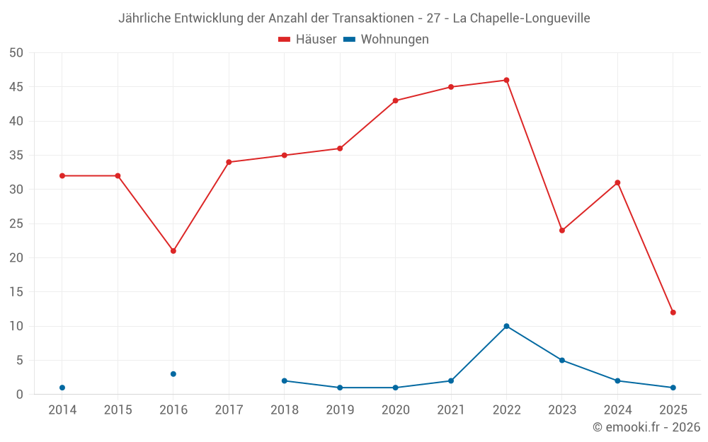 Der Durchschnittspreis auf den 30 Hausgeschäften der letzten 12 Monate in der Gemeinde La Chapelle-Longueville betrug 2 304 € pro Quadratmeter für einen mittleren Immobilienwert von 225 500 €. Über diesen Zeitraum hinweg lagen 60% der Transaktionen zwischen 1 931 und 2 739 € pro Quadratmeter (vom 2. bis zum 8. Dezil).