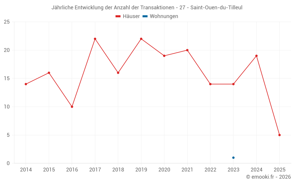 Der Durchschnittspreis auf den 17 Hausgeschäften der letzten 12 Monate in der Gemeinde Saint-Ouen-du-Tilleul betrug 1 781 € pro Quadratmeter für einen mittleren Immobilienwert von 166 000 €. Über diesen Zeitraum hinweg lagen 60% der Transaktionen zwischen 1 371 und 1 981 € pro Quadratmeter (vom 2. bis zum 8. Dezil).