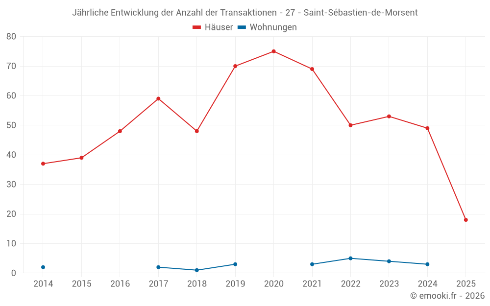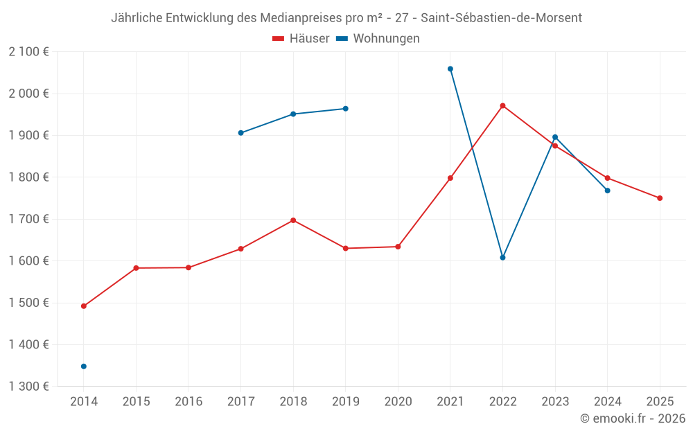 Der Durchschnittspreis auf den 18 Hausgeschäften der letzten 6 Monate in der Gemeinde Saint-Sébastien-de-Morsent betrug 1 750 € pro Quadratmeter für einen mittleren Immobilienwert von 183 975 €. Über diesen Zeitraum hinweg lagen 60% der Transaktionen zwischen 1 560 und 1 907 € pro Quadratmeter (vom 2. bis zum 8. Dezil).