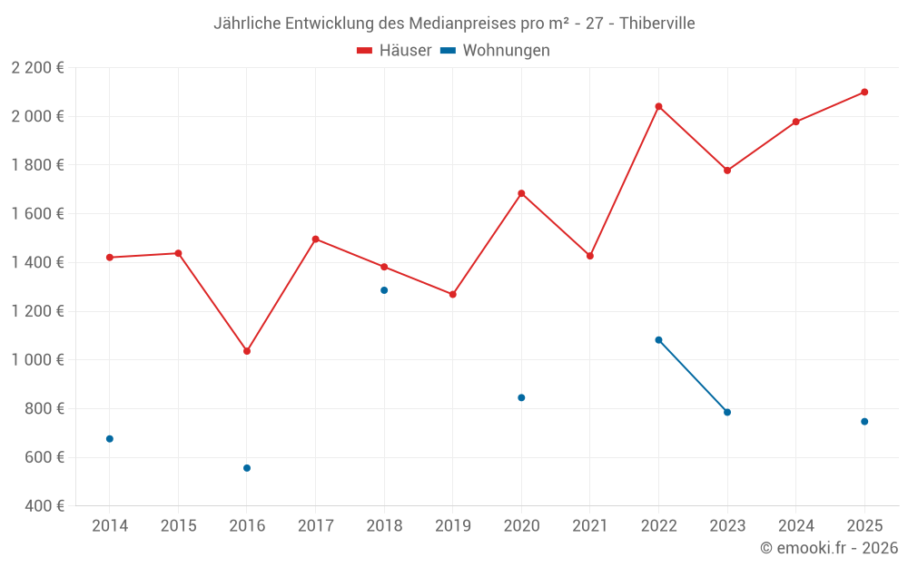 Der Durchschnittspreis auf den 21 Hausgeschäften der letzten 12 Monate in der Gemeinde Thiberville betrug 2 013 € pro Quadratmeter für einen mittleren Immobilienwert von 164 000 €. Über diesen Zeitraum hinweg lagen 60% der Transaktionen zwischen 1 703 und 2 411 € pro Quadratmeter (vom 2. bis zum 8. Dezil).