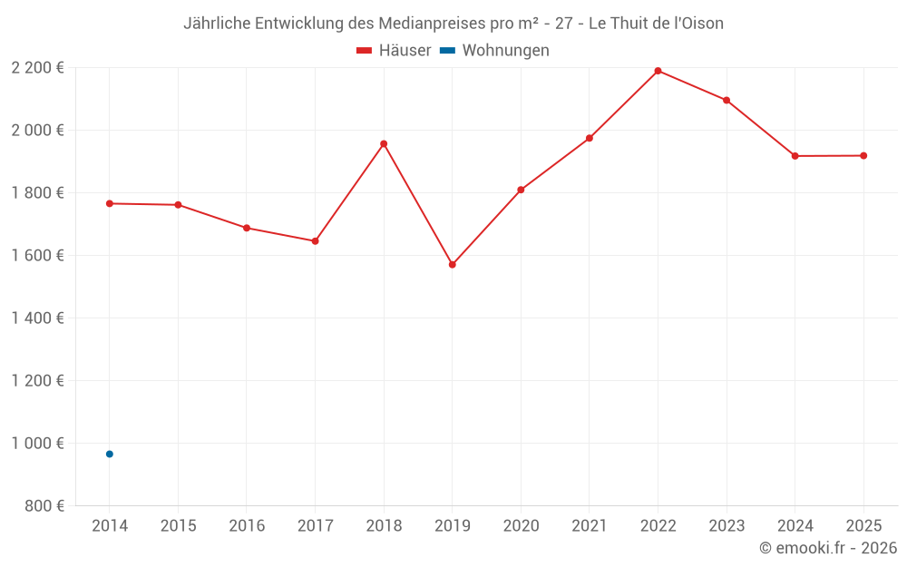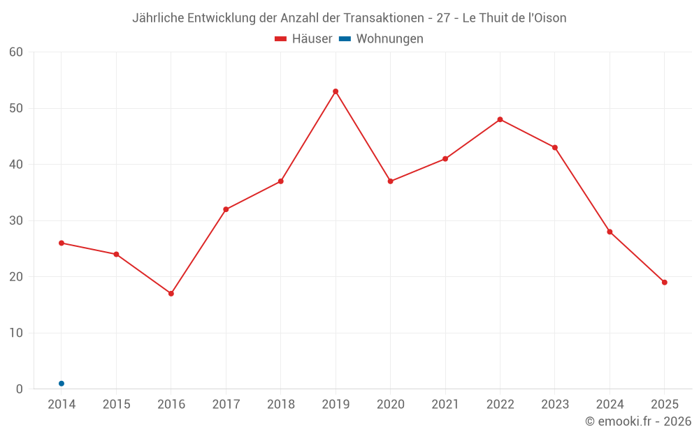 Der Durchschnittspreis auf den 19 Hausgeschäften der letzten 6 Monate in der Gemeinde Le Thuit de l'Oison betrug 1 919 € pro Quadratmeter für einen mittleren Immobilienwert von 225 000 €. Über diesen Zeitraum hinweg lagen 60% der Transaktionen zwischen 1 426 und 2 628 € pro Quadratmeter (vom 2. bis zum 8. Dezil).