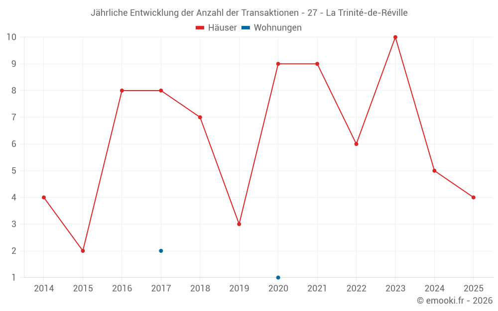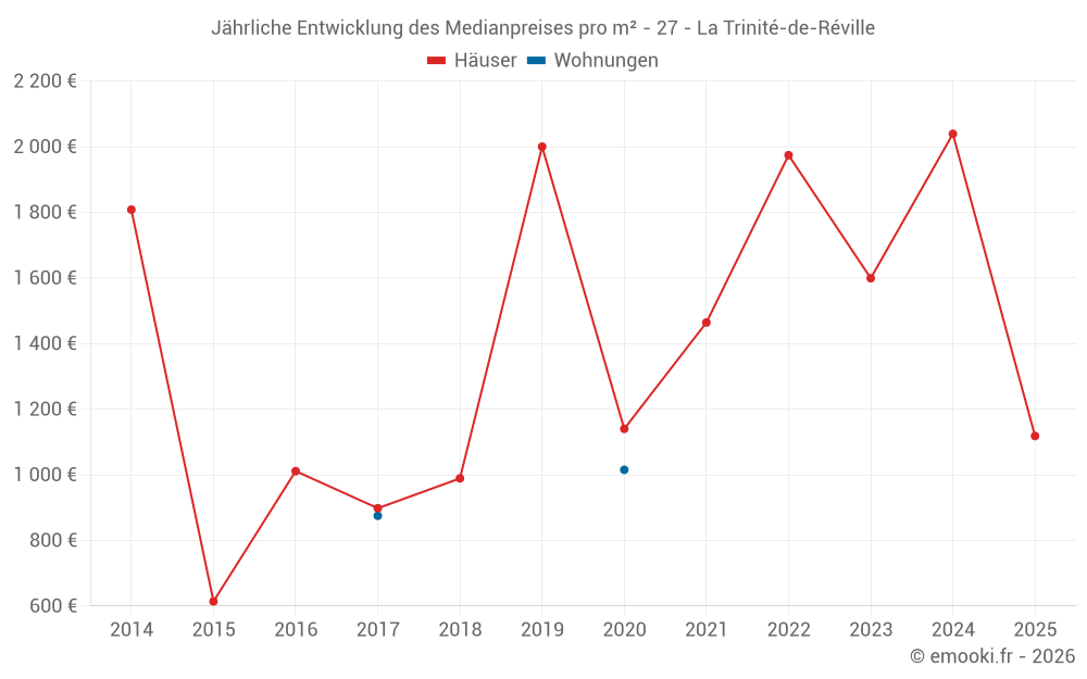 Der Preis pro m² von Häusern ist seit 1 Jahr um 45% gesunken, aber er ist in 8 Jahren um 24% gestiegen.