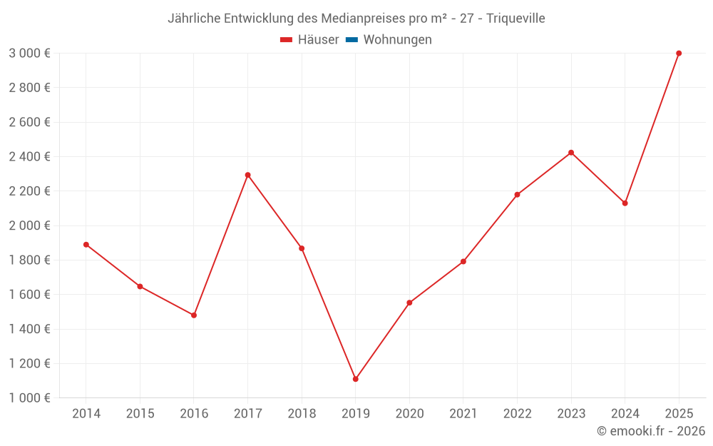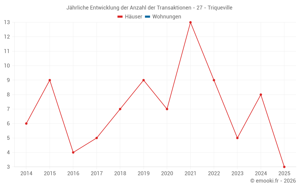 Der Durchschnittspreis auf den 14 Hausgeschäften der letzten 24 Monate in der Gemeinde Triqueville betrug 2 194 € pro Quadratmeter für einen mittleren Immobilienwert von 173 500 €. Über diesen Zeitraum hinweg lagen 60% der Transaktionen zwischen 1 594 und 3 096 € pro Quadratmeter (vom 2. bis zum 8. Dezil).