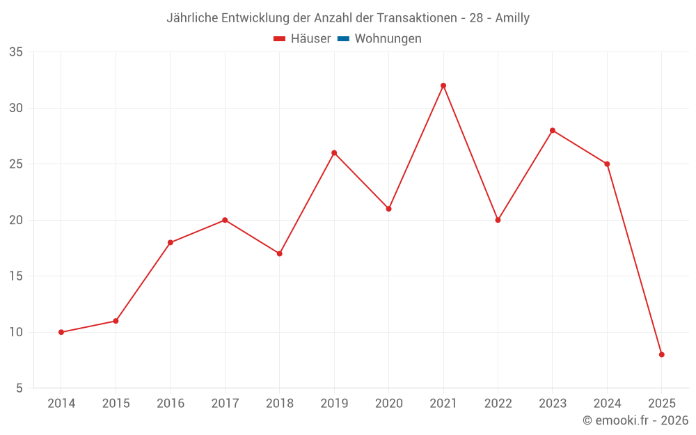 Der Durchschnittspreis auf den 23 Hausgeschäften der letzten 12 Monate in der Gemeinde Amilly betrug 2 054 € pro Quadratmeter für einen mittleren Immobilienwert von 190 955 €. Über diesen Zeitraum hinweg lagen 60% der Transaktionen zwischen 1 727 und 2 467 € pro Quadratmeter (vom 2. bis zum 8. Dezil).