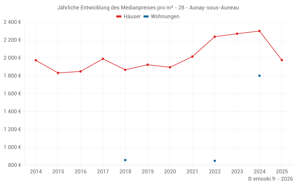 Der Durchschnittspreis auf den 30 Hausgeschäften der letzten 24 Monate in der Gemeinde Aunay-sous-Auneau betrug 2 158 € pro Quadratmeter für einen mittleren Immobilienwert von 192 975 €. Über diesen Zeitraum hinweg lagen 60% der Transaktionen zwischen 1 669 und 2 637 € pro Quadratmeter (vom 2. bis zum 8. Dezil).