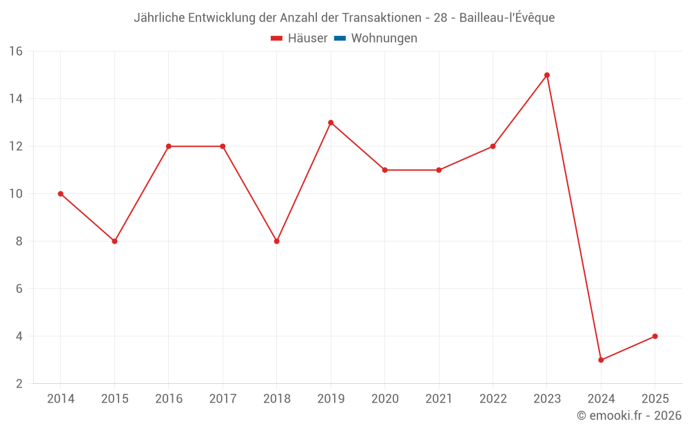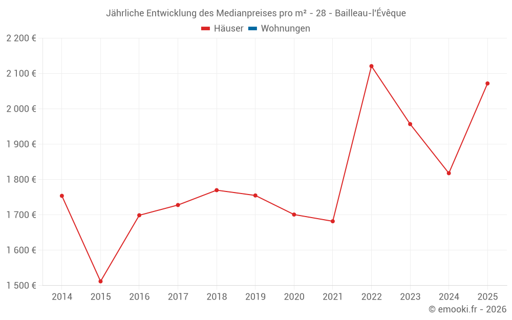 Der Durchschnittspreis auf den 15 Hausgeschäften der letzten 24 Monate in der Gemeinde Bailleau-l'Évêque betrug 2 123 € pro Quadratmeter für einen mittleren Immobilienwert von 220 000 €. Über diesen Zeitraum hinweg lagen 60% der Transaktionen zwischen 1 127 und 2 248 € pro Quadratmeter (vom 2. bis zum 8. Dezil).